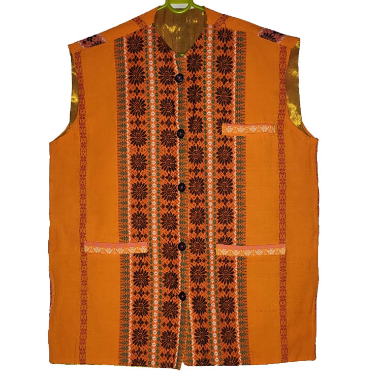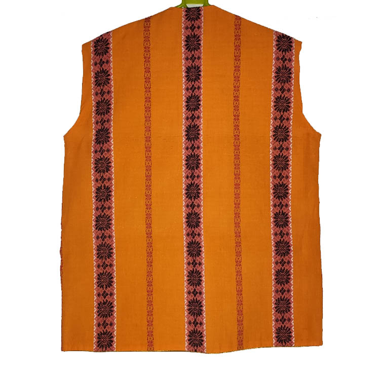 About Waist Coat: The Bodo traditional waist coat is an essential part of men's ethnic attire among the Bodo people of Assam. It is typically made from handwoven cotton and showcases the craftsmanship and design sensibilities unique to the Bodo community.